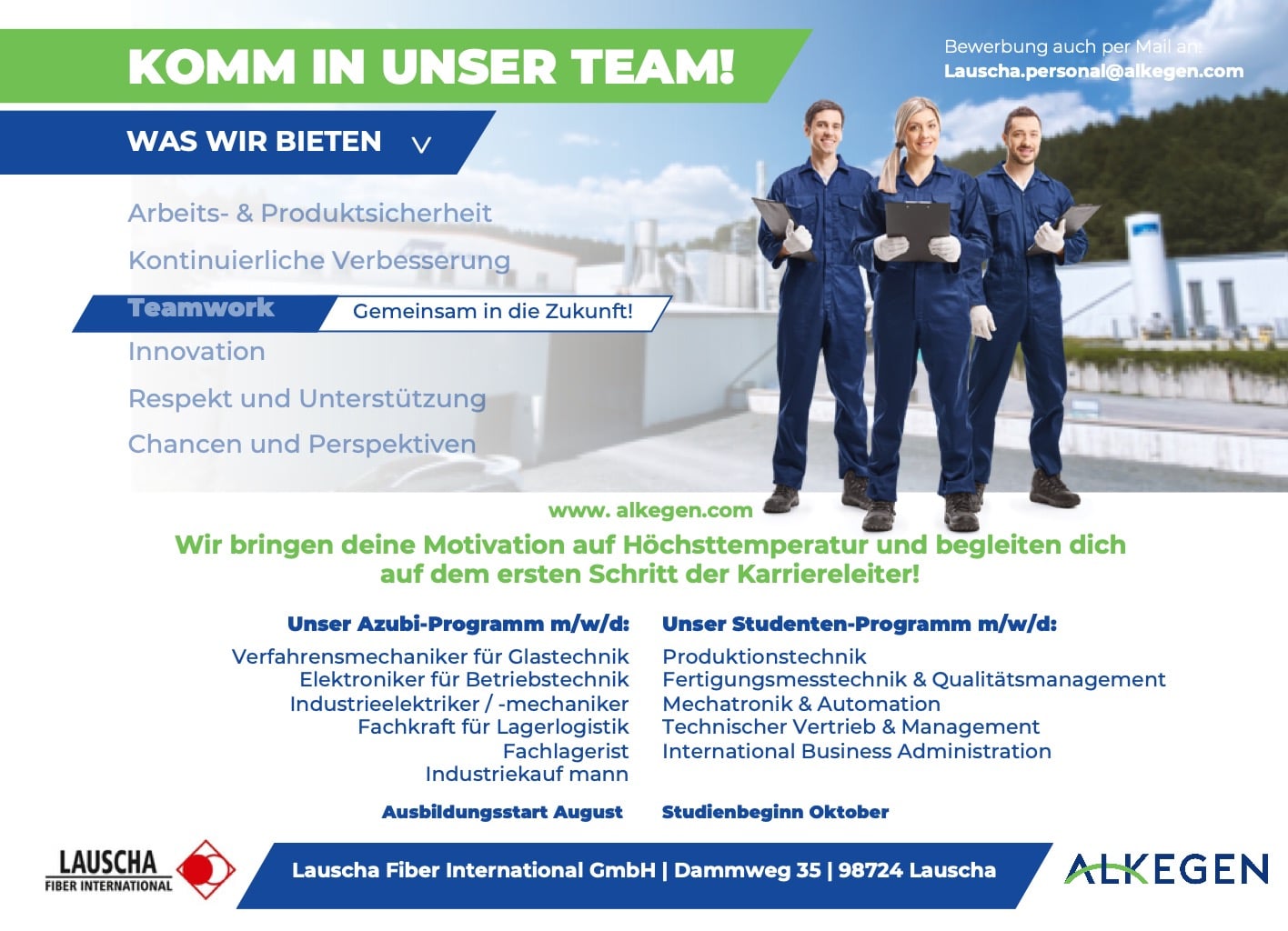 Als Bestandteil der Alkegen Gruppe ermöglichen wir unseren Mitarbeitern Qualifizierungen in unterschiedlichen Einsatzbereichen an allen Standorten und somit das Sammeln von Auslandserfahrungen. Basis dafür ist ein hoher Grad an Kompetenz, Engagement, Flexibilität, Zuverlässigkeit, Verantwortungsbewusstsein und Teamgeist. Unsere Glasschmelzwannen und Glasherstellungsanlagen werden 365 Tage im Jahr betrieben. Voraussetzung dafür ist die Bereitschaft von rund 60 Prozent unserer Mitarbeiter zur Arbeit im 4-Schichtsystem. Diese wird durch Zahlung einer kontinuierlichen Schichtzulage, steuerfreien Schichtzuschlägen und erhöhten Urlaubsanspruch entlohnt. Weiterhin kann sich jeder Mitarbeiter über unser betriebliches Vorschlagswesen aktiv im Unternehmen einbringen und mitwirken.